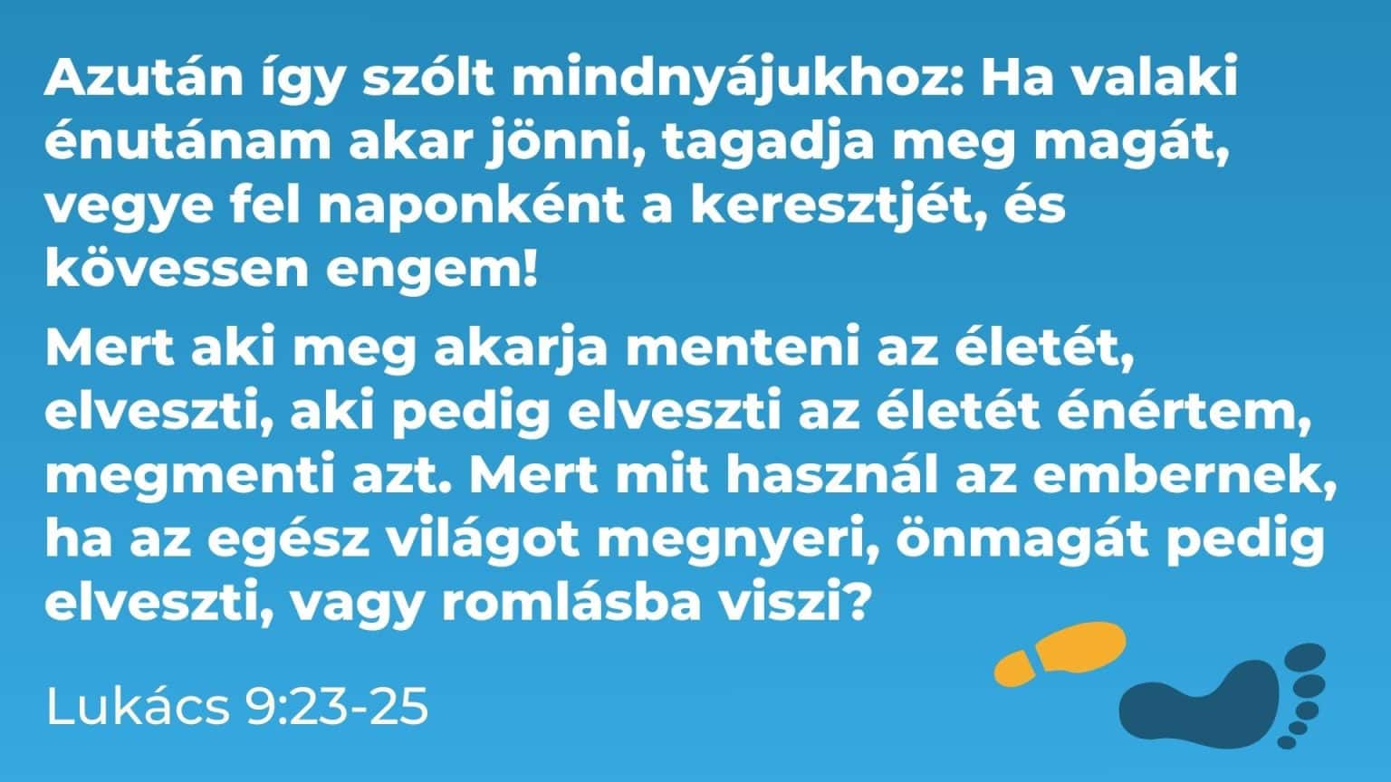 Azután így szólt mindnyájukhoz: Ha valaki énutánam akar jönni, tagadja meg magát, vegye fel naponként a keresztjét, és kövessen engem! Mert aki meg akarja menteni az életét, elveszti, aki pedig elveszti az életét énértem, megmenti azt. Mert mit használ az embernek, ha az egész világot megnyeri, önmagát pedig elveszti, vagy romlásba viszi?